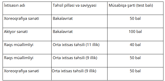 Bildirilib ki, bundan əlavə, bakalavriat təhsil səviyyəsi üzrə xoreoqrafiya sənəti ixtisasının ifaçılıq fənni üzrə qabiliyyət imtahanında abituriyentlər (subbakalavrlar) 3 müxtəlif xarakterli rəqs ifa edəcəklər.