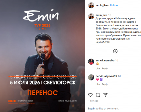 Xalq artisti Emin Ağalarovun 3 gün sonra Rusiyanın Kalininqrad vilayətinin Svetloqorsk şəhərində baş tutacaq konserti təxirə salınıb.