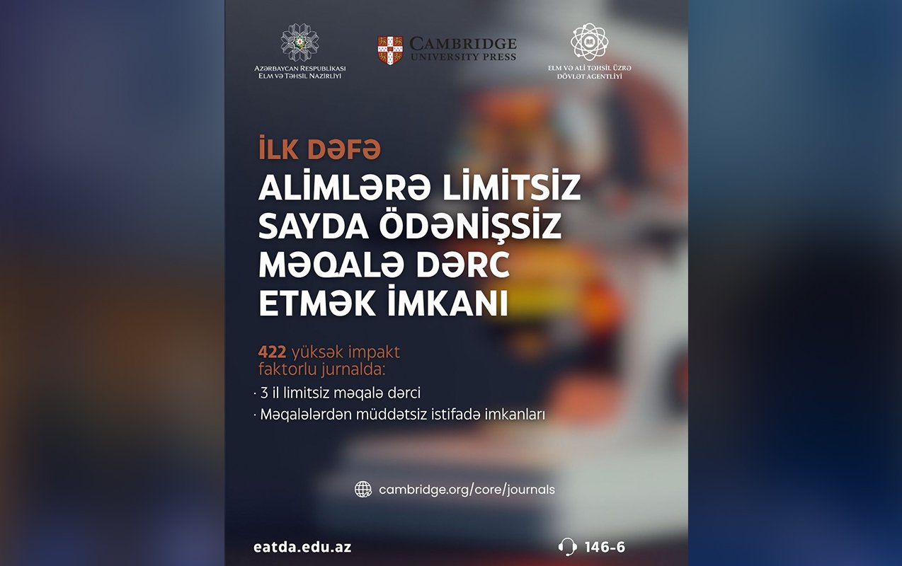 Elm və Təhsil Nazirliyi və Böyük Britaniyanın nüfuzlu Kembric Universitetinin “Cambridge Press” nəşriyyatı arasında əldə edilmiş razılığa əsasən, Azərbaycanda fəaliyyət göstərən bütün müəlliflər növbəti 3 il ərzində “Cambridge Press” tərəfindən nəşr edilən 422 yüksək impakt faktorlu, hibrid və “gold” açıq əlyetərli (Open Access) jurnallarda limitsiz sayda məqalə dərc etmək imkanı əldə edib.