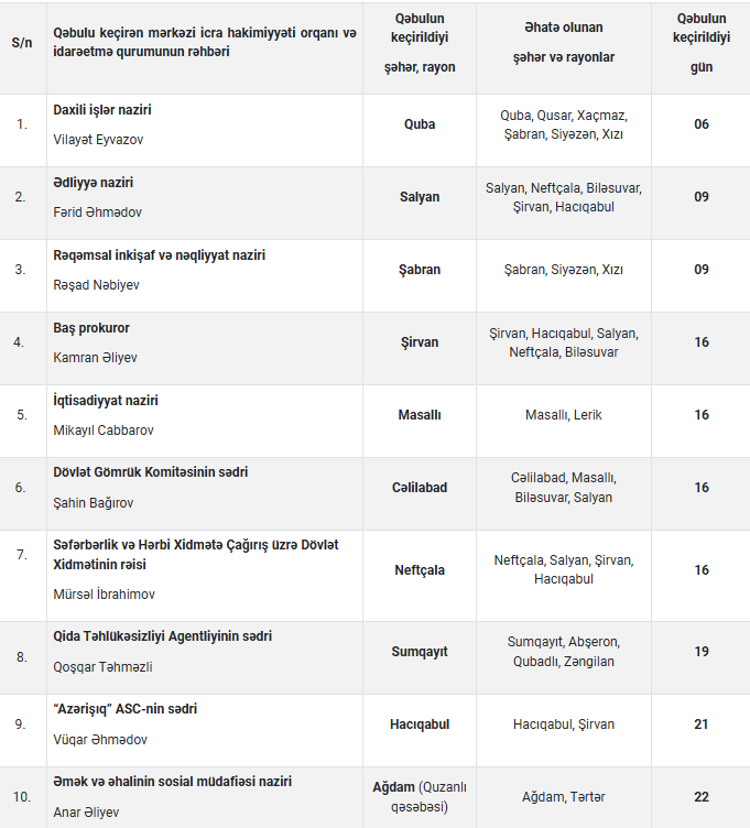Mərkəzi icra hakimiyyəti orqanlarının və digər idarəetmə qurumlarının rəhbərləri tərəfindən 2026-cı ilin yanvar ayında şəhər və rayonlarda keçiriləcək vətəndaşların qəbulu cədvəli açıqlanıb.